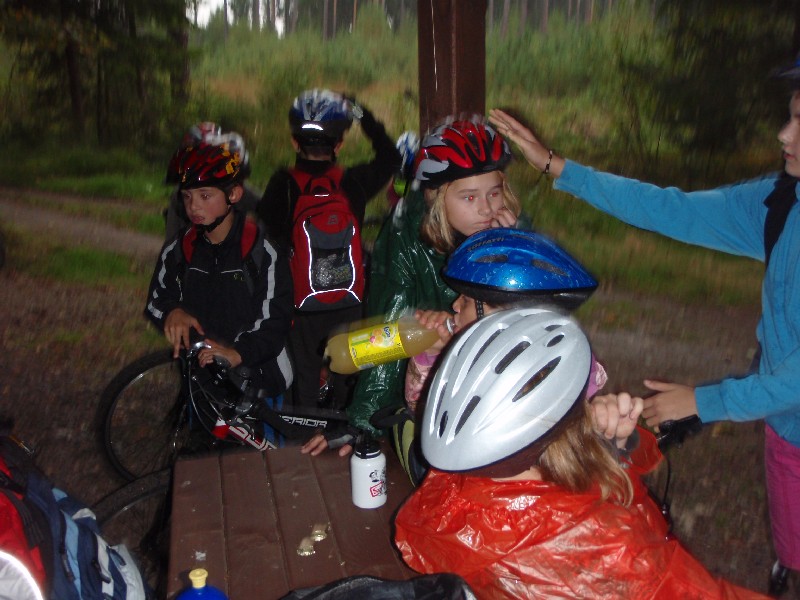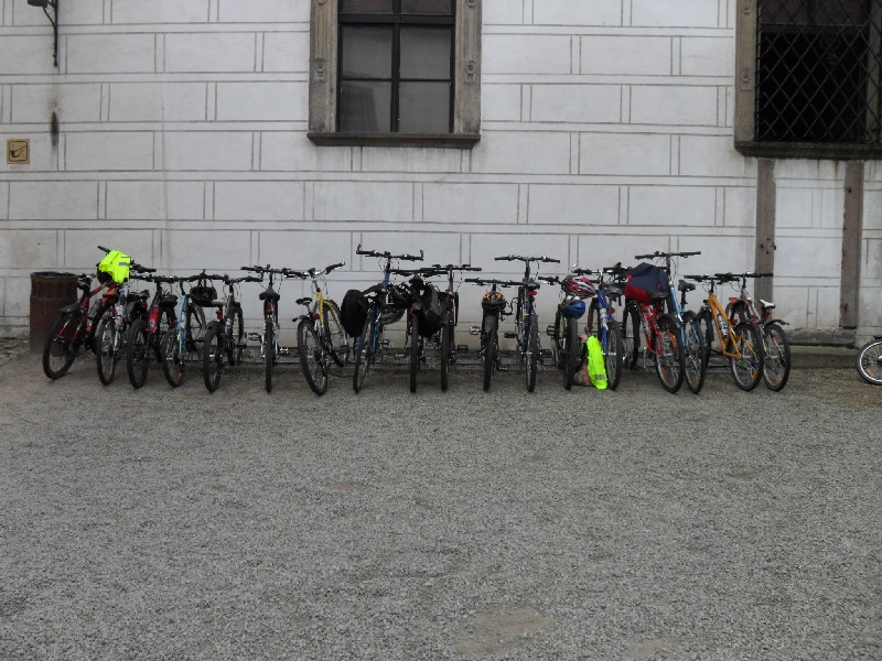 Včera po obědě jsme vyjeli do města Třeboně. Vybrali jsme si trasu přes Stříbřec, kolem Nové řeky, kde jsme jeli nádherným památným dubovým stromořadím u Novořecké Bašty jsme odbočili na žlutou značku a po lesní cestě rychlým tempem přijeli do starobylého města Třeboň. Prohlédli jsme si náměstí, zámek a zámecký park. Následoval rozchod na nezbytné nákupy. V půl čtvrté nás zaskočil prudký déšť, naštěstí jsme jej přečkali ukrytí na zahrádce restaurace a pod podloubím. Čekali jsme až do čtvrt na pět než se počasí umoudřilo. Po červené kolem lázní jsme se vydali na zpáteční cestu. Jaké bylo naše překvapení, když jsme zhruba po 500 m od náměstí zjistili, že tady vůbec nepršelo. Ale déšť nám nedal pokoj, začal nás pronásledovat. Proto jsme se na zpáteční cestě museli dvakrát ukrýt v turistických přístřešcích. Do penzionu jsme dorazili mírně navlhlí, ale opět v dobré náladě. K raním kilometrům jsme přidali dalších 32. V nohách za pondělí 63 km, ale až na výjimky všichni v dobré kondici a pouze mírně unaveni.