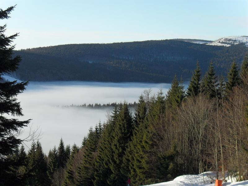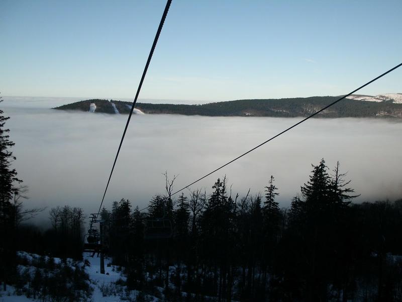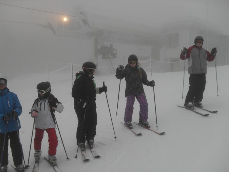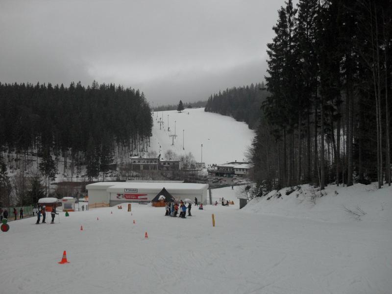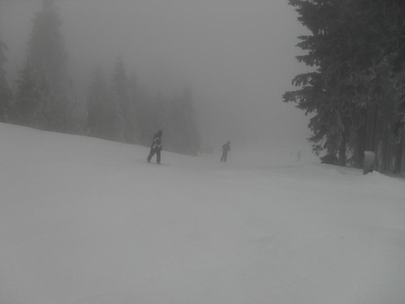 Při příjezdu na Hochficht není vidět více než na 10 metrů - mlha, teplota 0 st. Sjezdovky perfektně upraveny, tvrdé jako beton. Ještě, že mají všichni lyže ze servisu a dostatečně nabroušené hrany.