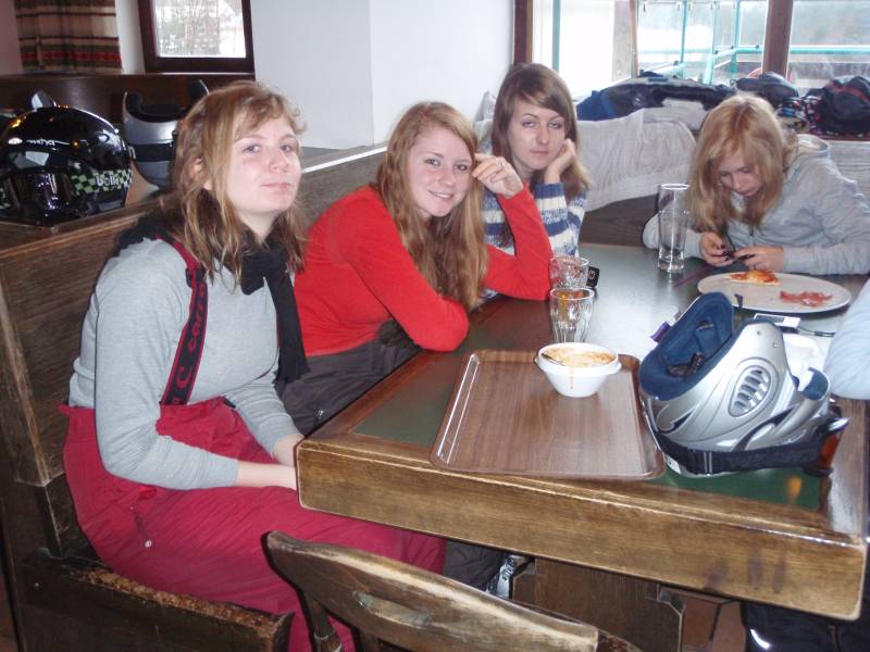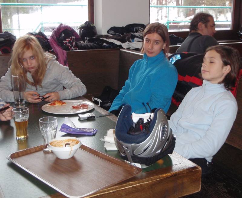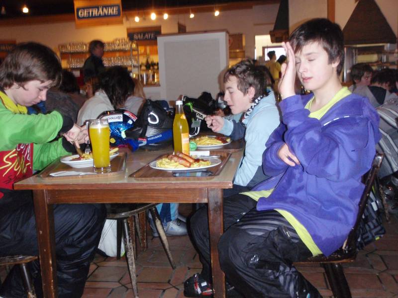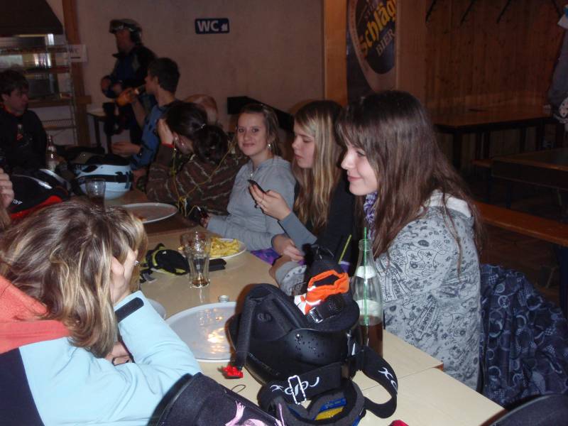 V poledne tradiční svačina v místní horské restauraci, někteří pojídají balíček a zapíjí čajem (především instruktoři), ostatní (děti) do sebe cpou hranolky o sto šest. Zřejmě platí heslo nesmím domů dovést ani jedno euro.