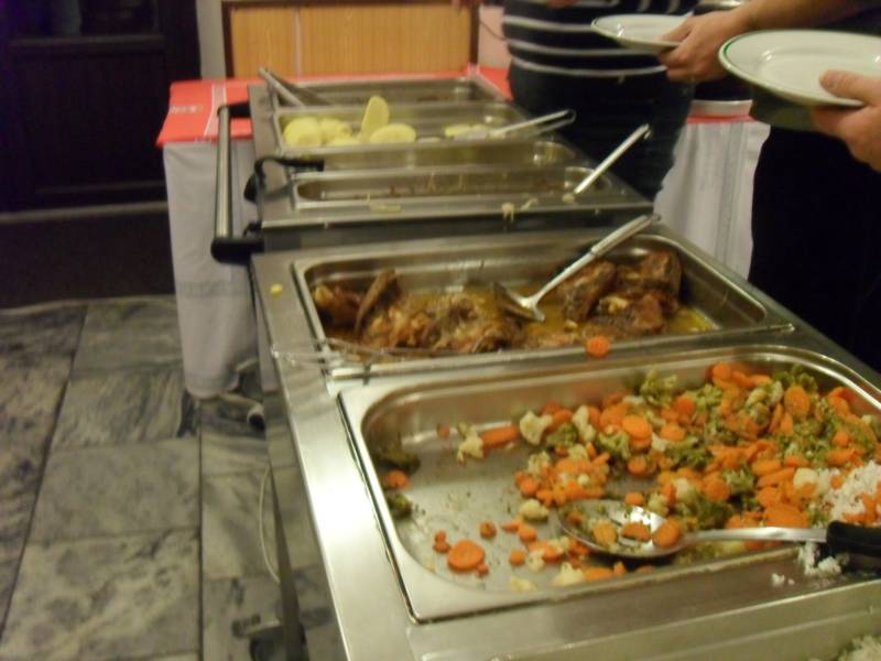 Hitem dnešní večeře jsou knedlíky a smetanová omáčka . Dnes všem důkladně vytrávilo, asi to počasí a kuchař nestačí naplňovat teplý bufet. Nakonec jsou k dostání pouze brambory a pangasius na másle. Kuchař ještě dodává hranolky, které původně nebyly v nabídce. Včera spousta jídla zbyla, dnes bylo vše kompletně vyjedeno.