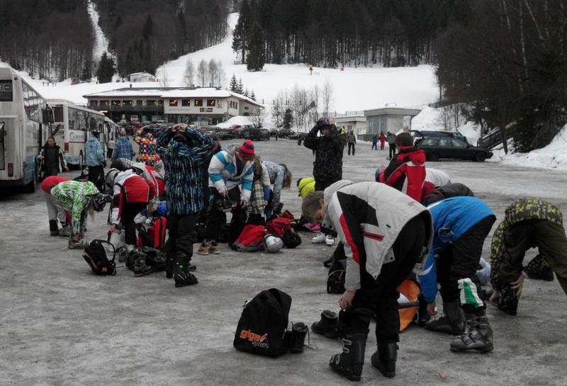 Bohužel opět nás po ránu vítá nevlídné počasí, je zataženo a prší. Při cestě autobusem se v autobuse vznáší skeptická nálada a hmatatelný odpor frekventantů k lyžování. Po přejezdu hranice jej ještě přiživuje intenzivní déšť na rakouské straně.
