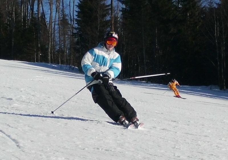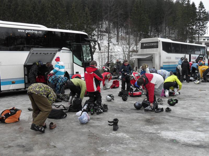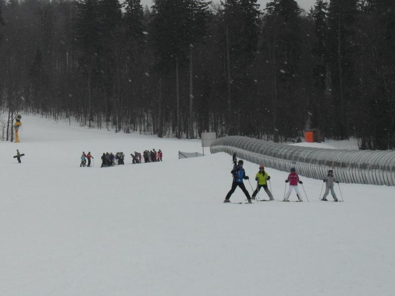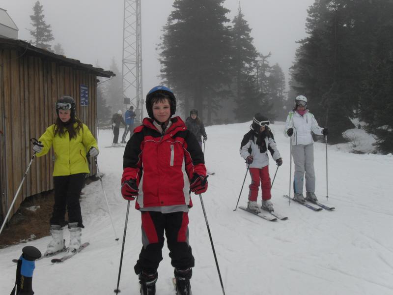 Ve středisku neprší, první pozitivní zpráva dne. Rozbalení lyží, obouvání bot a hurá na svah. Máme pouze jednoho nelyžaře, který piloval pluh na cvičné loučce. Rozdělení do družstev a další posílení družstva začátečníků.