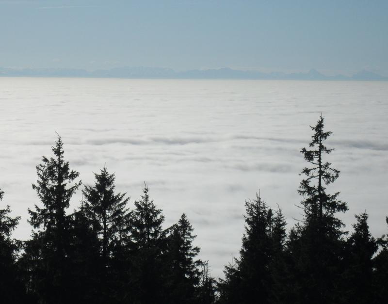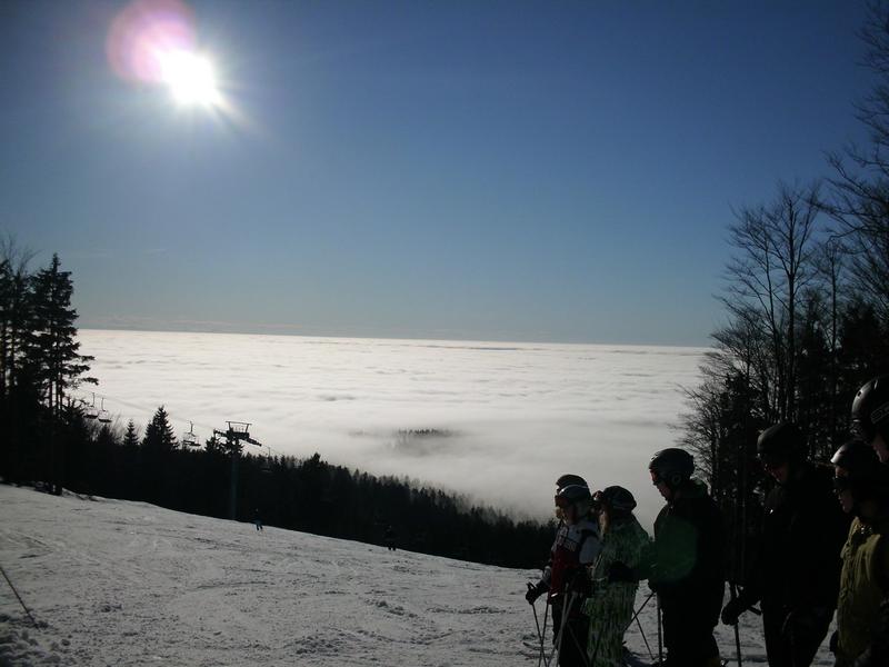 Po první jízdě žádná sláva, počasí nám nepřeje, ale jedenáctá to rozhodla, vylouplo se sluníčko a podmínky k lyžování jsou ideální. V údolí mlha a nahoře nádherné inverzní počasí. Perfektní viditelnost, v dálce jsou vidět majestátní vrcholy Alp.