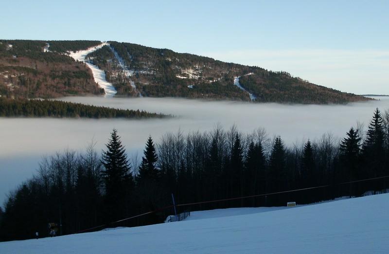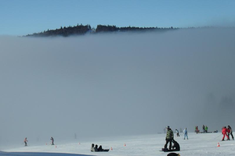 Přijíždíme na parkoviště k vlekům a aspoň u mne se nálada zlepšila, neprší, situaci kazí poměrně hustá mlha. Některé kurzy se slabším vedením ani nevybalují lyže a jdou rovnou k bufetu.