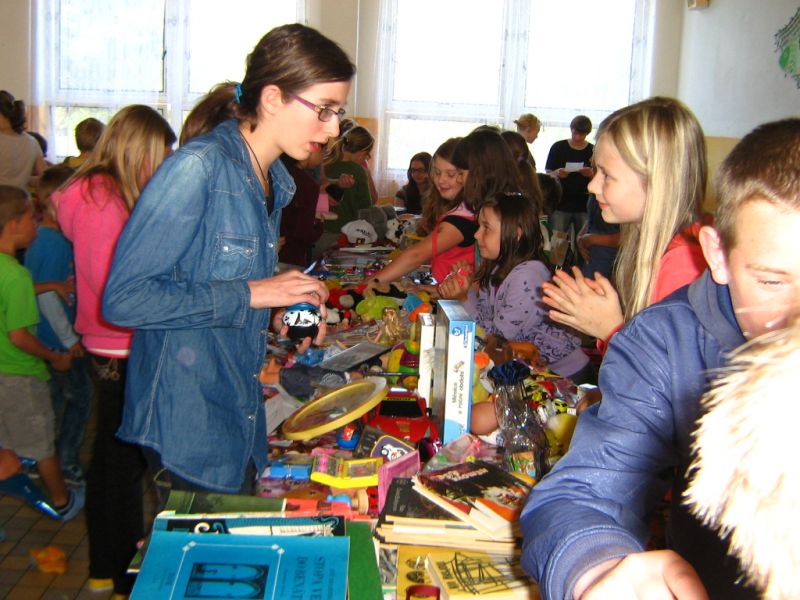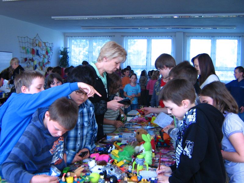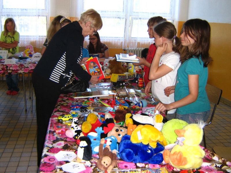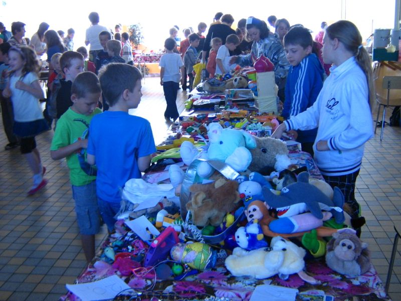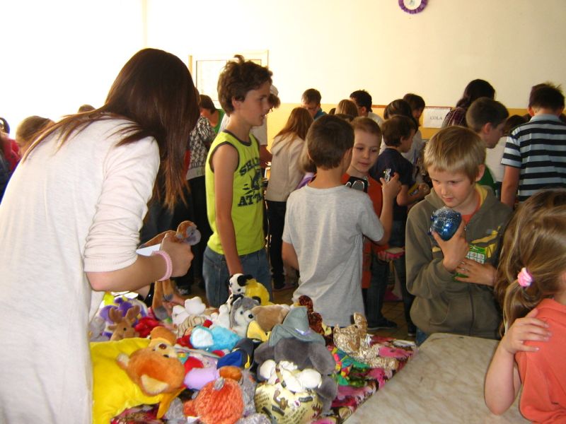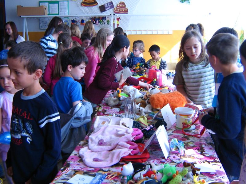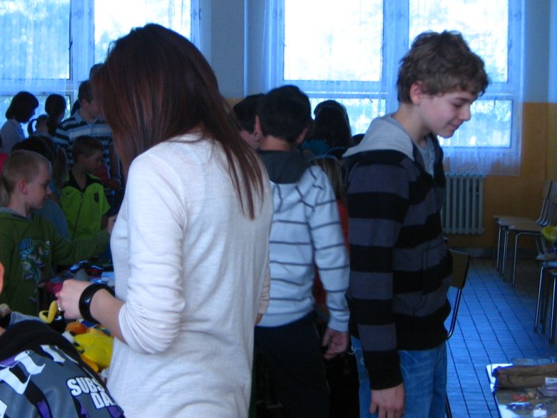 Žáci téměř všech ročníků a i učitelé přinesli z domova různé věci, vyložili je po stolech ve školní jídelně a následně si je zase zájemci nakupovali. Tuto akci opět navštívila paní Běla Gran Jensen, představitelka hnutí Na vlastních nohou - Stonožka, která přivezla několik věcí do prodeje a sama si také nakoupila. Nejúspěšnějšími třídami, které vydělaly u svých „stánků" nejvíce, byly 4. A s 1 482 Kč a 4. B s 1 251 Kč. Celkem jsme takto získali 12 852 Kč.
