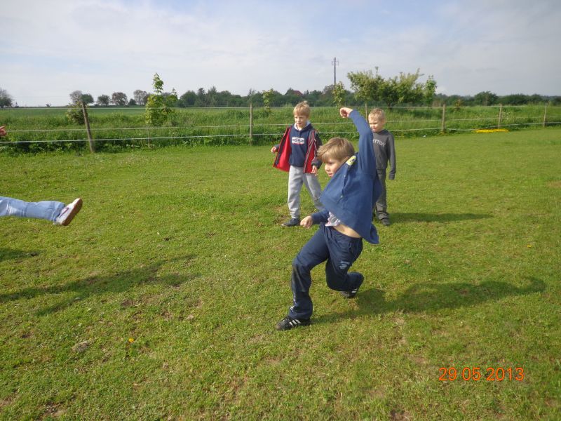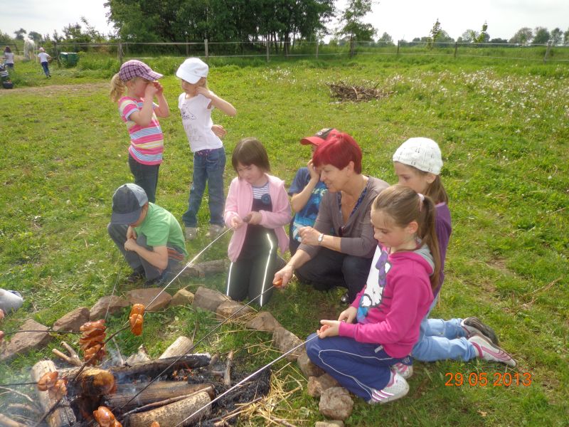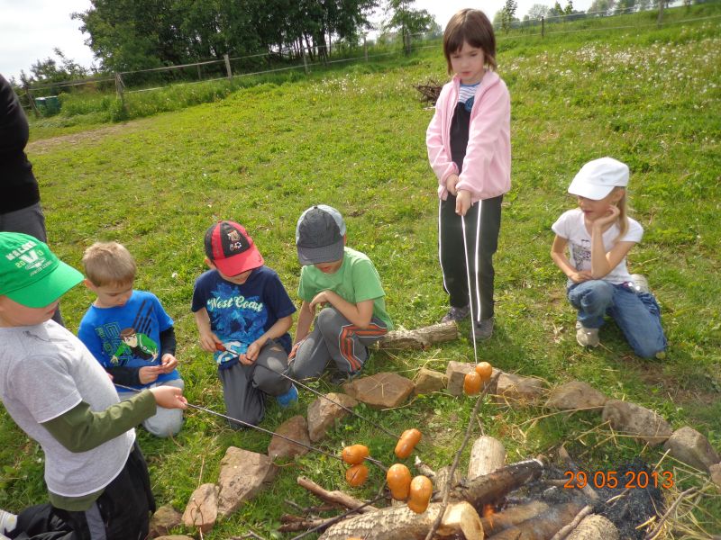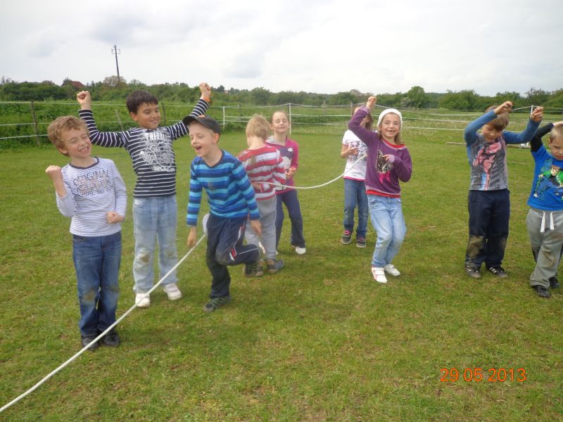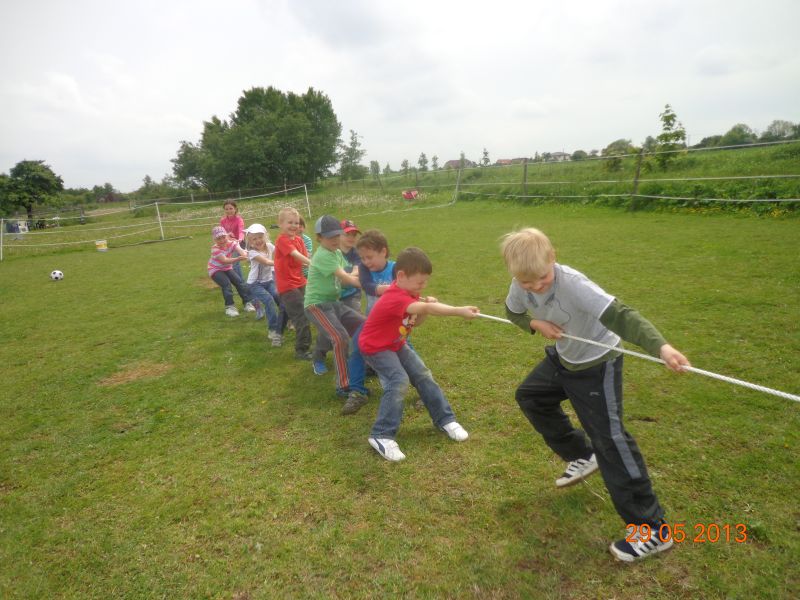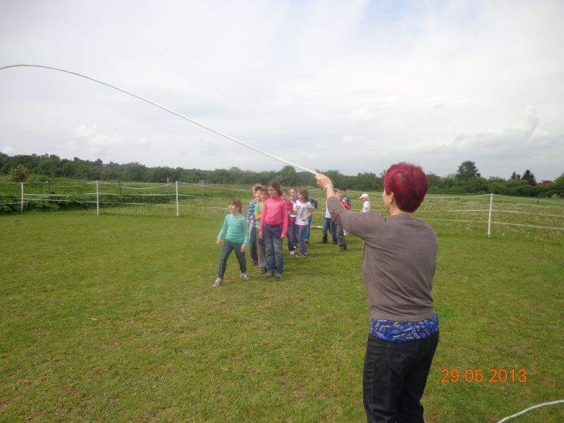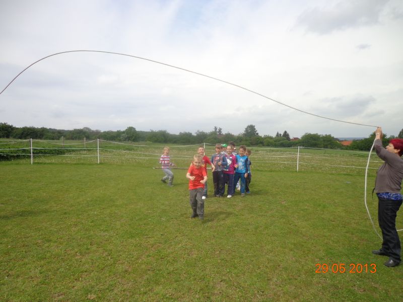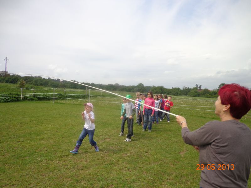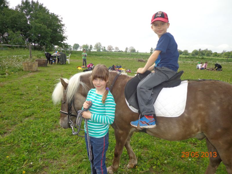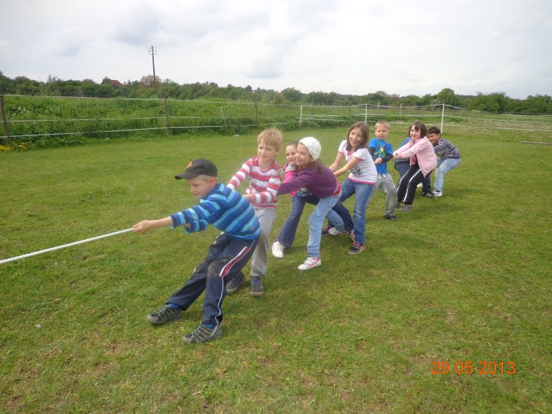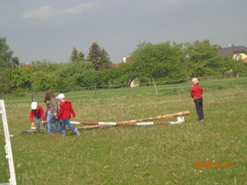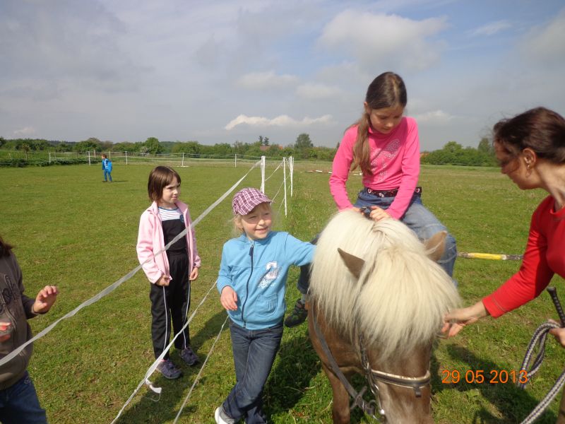 Doma mají dva krásné koně a jednoho poníka. Něco jsme se o koních dozvěděli a děti se pak na poníkovi Alíkovi svezly. Soutěžilo se v podbíhání a přetahování lanem. Kluci hráli fotbal, děvčata prozkoumávala okolí.