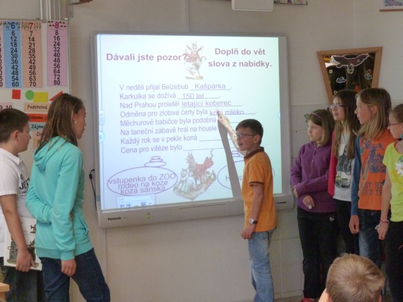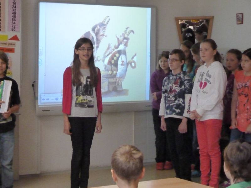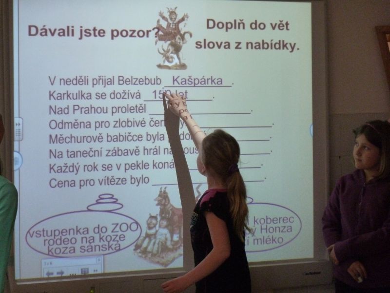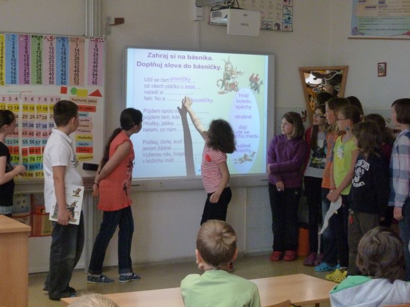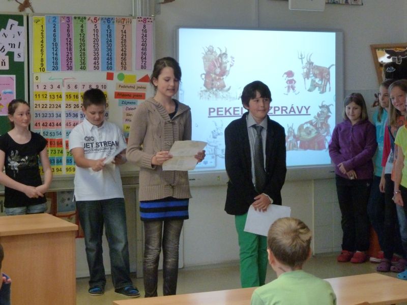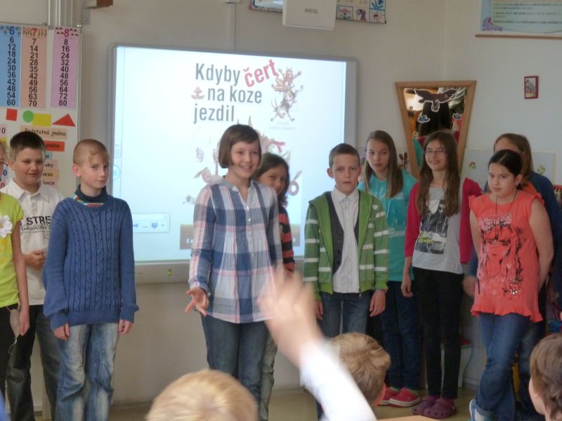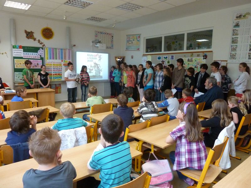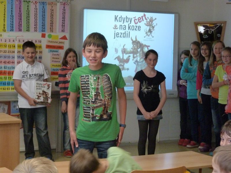 Děti z páté třídy si v rámci celoročního projektu věnovanému rozvoji čtenářské gramotnosti pro vzácnou návštěvu a své mladší kamarády připravily program plný básniček pana Novotného, veselého čtení a povídání z knihy „Kdyby čert na koze jezdil“. Pan spisovatel i děti se velice bavili a program všechny opravdu zaujal.