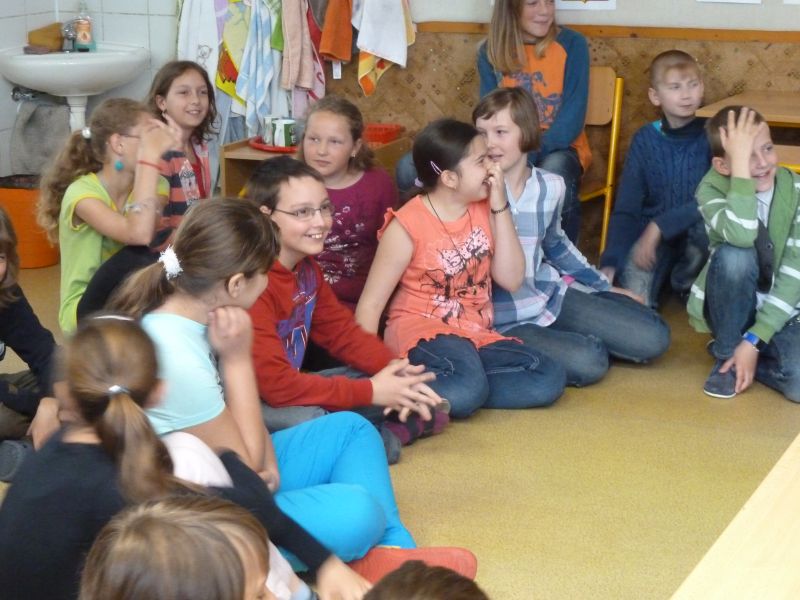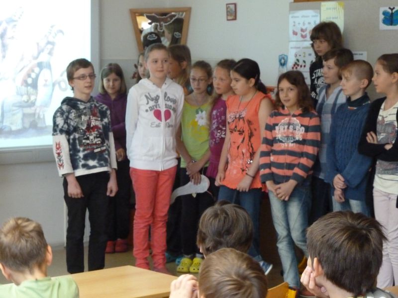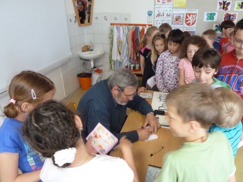 Ve druhé části pořadu se pan Novotný rozpovídal o své práci, dětství, zavzpomínal i na kamarády, první lásky a přečetl ukázky ze své tvorby. Zazněly také dvě písničky s jeho texty. Poutavé vyprávění se všem líbilo a na závěr zbyl čas i na zvídavé otázky dětí. Většina žáků získala podpis pana spisovatele s krásným přáním.