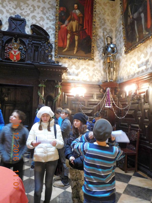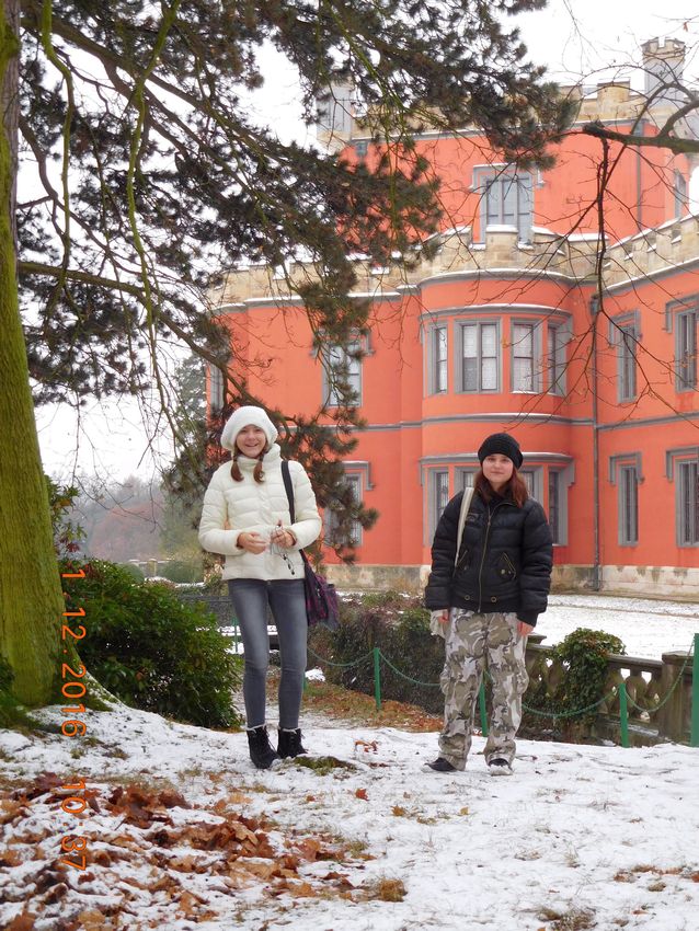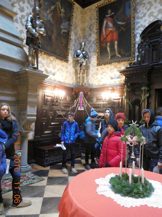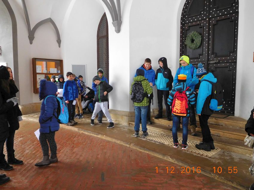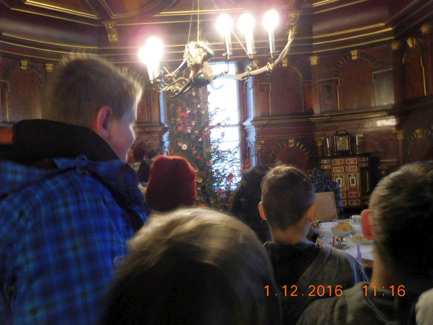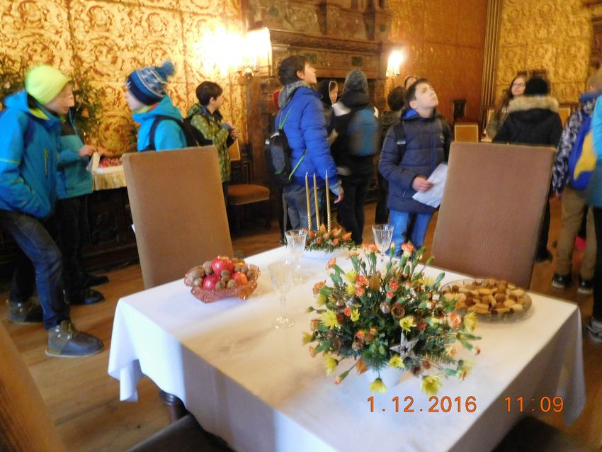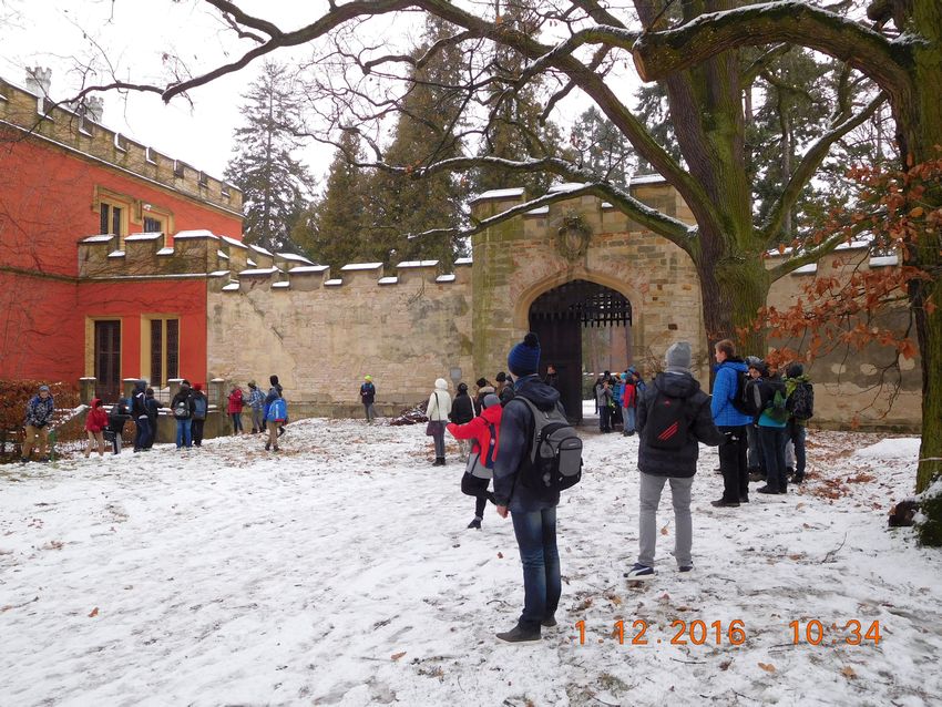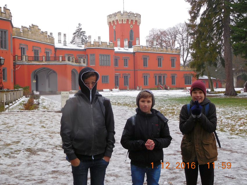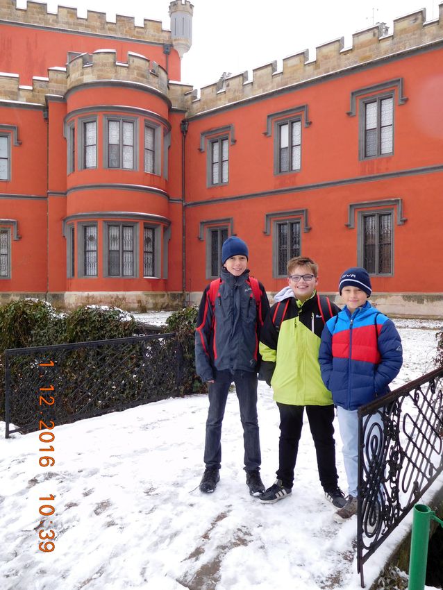 Navštívili jsme totiž nádherně vánočně vyzdobený zámek v Hrádku u Nechanic. V jednotlivých místnostech jsme obdivovali ozdobené stromečky (spíše stromy až do stropu) s nápaditými ozdobami z nejrůznějších materiálů. Prostřené stoly přímo lákaly k zasednutí a hodování. Dověděli jsme se mnoho informací o zvycích našich předků v době Vánoc. Získané vědomosti pak žáci použili při vyplňování pracovních listů. Mimochodem, víte, že první stromeček se u nás objevil r. 1812, že hlavním štědrovečerním jídlem v Polabí bylo uzené maso, že k oblíbené výzdobě kromě adventního věnce patřila také třesolka (rozřezané stéblo slámy s nalepenými zrnky obilí či hrachu, které bylo zabodnuté v jablku a v průvanu se třáslo)? Pokud posíláte svým bližním vánoční pohlednice, tak tento zvyk u nás zavedl hrabě Karel Chotek už ve 30. letech 19. století. Aby vánoční idyla byla dokonalá, všude kolem zámku ležel sníh. Nebylo ho mnoho, na koulovačku to ale bohatě stačilo.