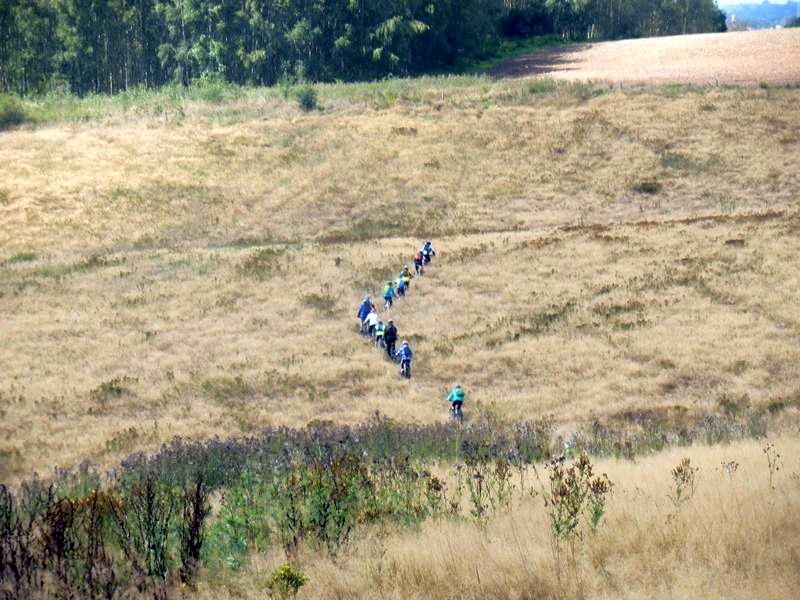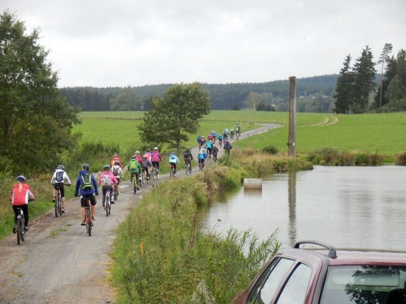 Jsme na místě, cestou se střídá sluníčko a občas hrozí déšť. Procházíme naučnou stezku naši nejmladší sopky. Jedná se oblíbené místo německého básníka J.W.Gothe. Má zde také památník. Jako vždy se nám nechce vracet cestou, kterou jsme přijeli. Proto míříme nejprve na Cheb a poté se stáčíme k vodní nádrži Skalka a jedeme do Cetnova. Zde se ukazuje, že turistická cesta končí a dál se nedostaneme. Místní domorodci říkají, že se musíme vrátit odkud jsme přijeli, to znamená vyšlapat cca 3 km do kopce, který jsme si před chvilkou s vervou užívali. Nepřistupujeme na jejich návrhy a vybíráme cestu po louce. Cestu, ona tam žádná není, chvíli vidíme stopy po traktoru. Je to perfektní cross country, Určitě tudy před námi nikdo nejel. Vypadá to jako na irském vřesovišti, tráv nám sahá minimálně po pás. Chvíli po vrstevnici, chvíli z kopce a pak logicky do kopce. Taky musíme překonat, jako na správné steeplchase oranici, i tu zvládáme. Zhruba po dvou kilometrech cesty necesty, jetí nejetí jsme v obci Bříza, máme vyhráno, další regulérní cesta je nedaleko. Pokračujeme zpátky na Dubinu po parádní cyklostezce, jenom musíme překonat pár brdků. Před jednou jsme zpět v nohách 22 km, obohaceni o nové znalosti z geologie.