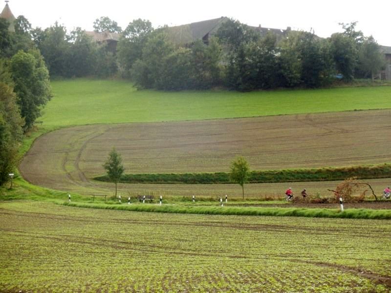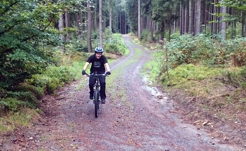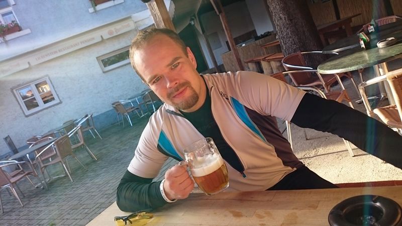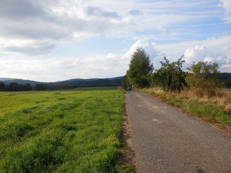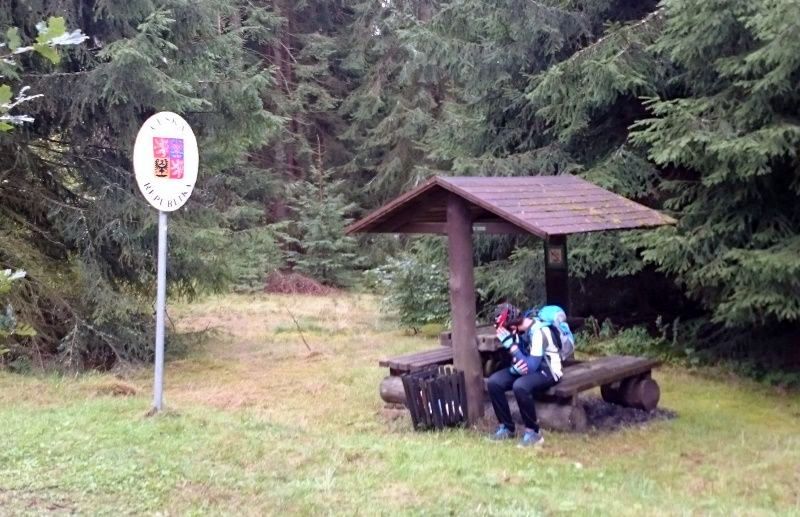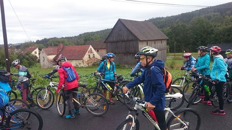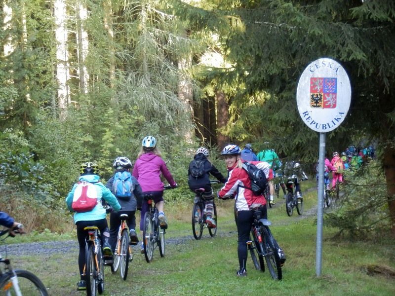 Pokračujeme kolem Ohře proti jejímu proudu po cylkostezce na německé straně. Máme v plánu jet po červené a poté se vrátit na českou stranu. Dobrý plán. Ukazuje se, že, stoupání k hradu Hohenberg byla jenom dětská procházka. I místní nás sledují udiveně, kam jsme se to vydali, ale srdečně nás zdraví. Postupně překonáváme, nejprve po asfaltce, poté po lesní cestě, několik horských hřebenů. Cesta je příjemná, houby se sbírají ze sedla kola a nálada v družstvu je velmi pozitivní. K německo-české hranici se nakonec dostáváme asi po 7 km poměrně intenzivního stoupání. Fotíme se u hraničních kamenů a ze západu nás zdraví sluníčko. Následuje prudký sjezd do Libé, nahoru se hrabete hodinu a pak jste za 15 minut dole. Již na hranici obce píchl Honza kolo. Čtvrtá závada... Protože k obchodu, kde budeme nakupovat, je to sotva kilometr, vede kolo a za chvíli je u nás. Honem na nákup, zásoby docházejí. Závěrečný transport na Dubinu absolvuje Honza v tandemu za Markem na jednom kole. Odnra mu veze jeho stroj. Je osmnáct hodin a my jsme zpátky. V nohách 18 km, nálada výborná, sluníčko nad námi.