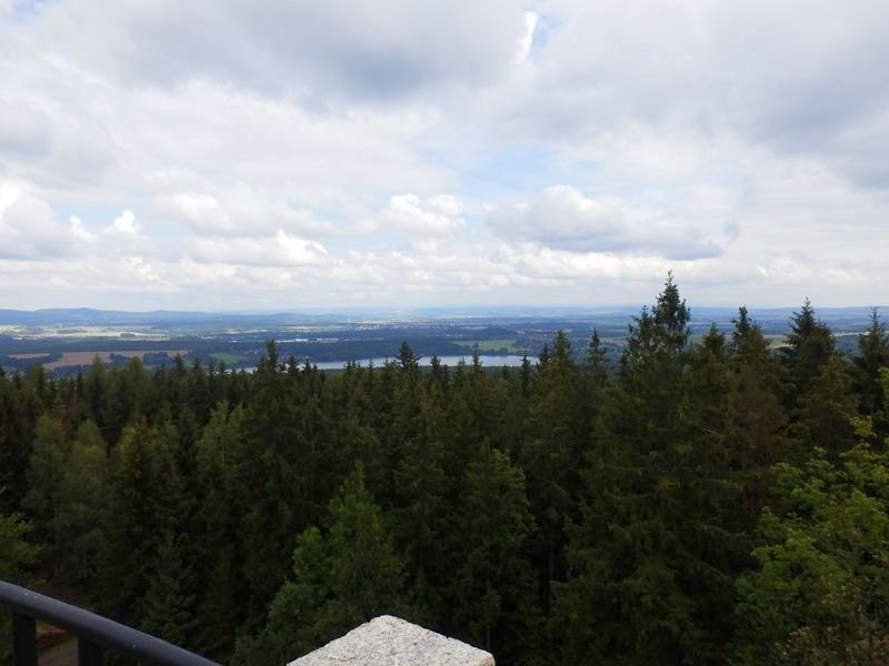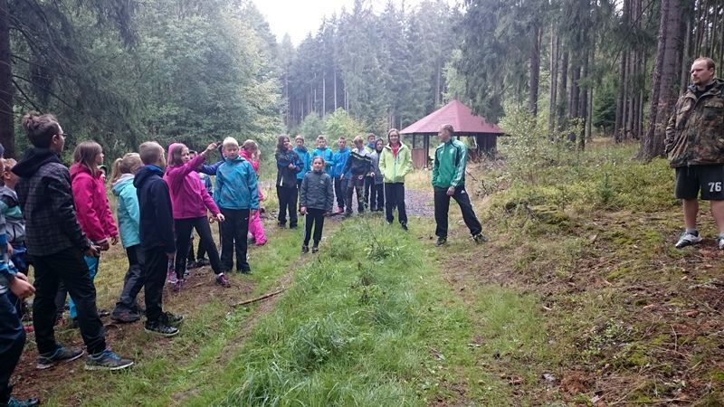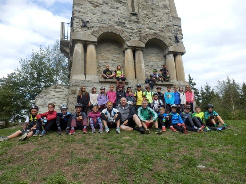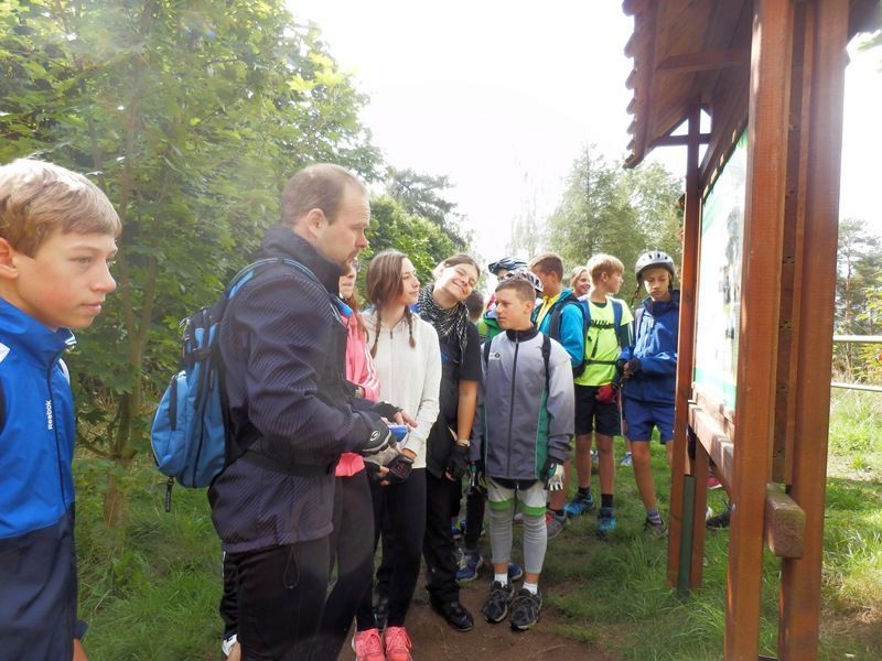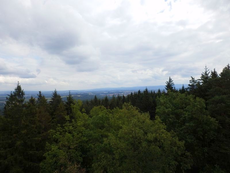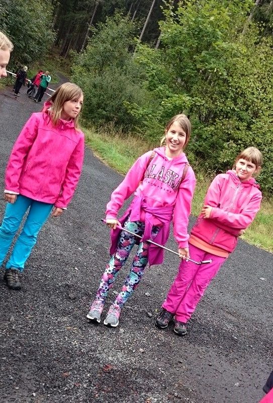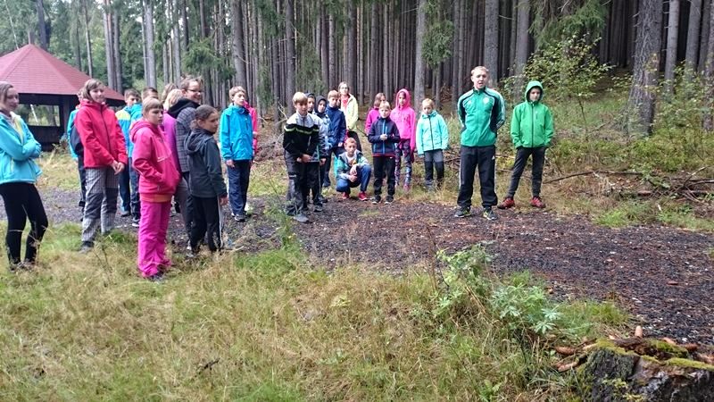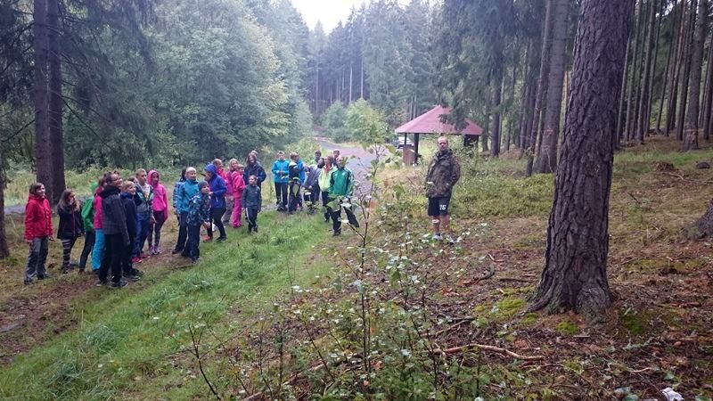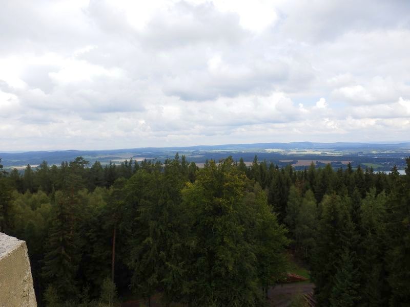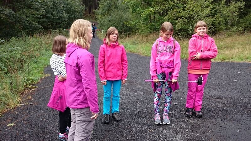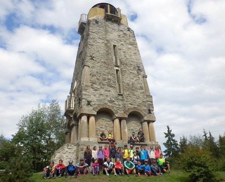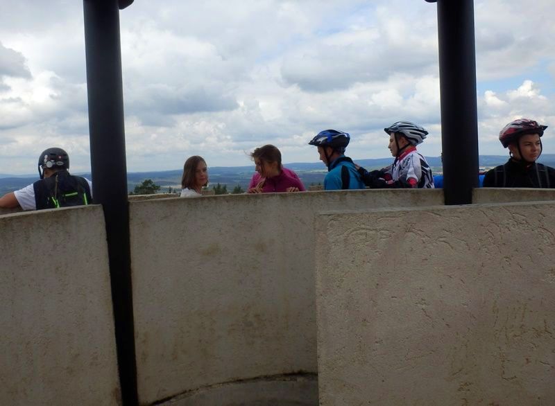 Rozhledna je to solidní, kamenná, postavena na začátku minulého století turistickým spolkem z Chebu. Až k výhledu je to 70 schodů tvrdí Petra, paní učitelka se dostala k číslu 72. Nevím komu mám věřit, vyberete si. Je krásný pohled na okolní krajinu - Cheb, Smrčina i Český les jako na dlani. Po prohlídce, část svěřenců hledá kešku, část běhá po lese s kouzelnými hůlkami, někteří rozumně relaxují. Pokud nevíte co je to kouzelná hůlka, pokusím se to vysvětlit. Hoši ze 7.ročníku, ti co se jim nedaří uklízet, mají údajně ve skříni trpaslíka. Nevím kde se tam vzal, ale kouzelná hůlka pomáhá v potírání jeho schopností. Inu nebudu jim brát iluze, ale nerozumím tomu, proč teď běhají po lese a řvou. Pár skalních houbařů, už zase čenichá houby, tentokrát naštěstí nesbírají, ale jenom hlásí nalezené kusy. V očích mají smutek, že jsou o tuto kratochvíli násilím připraveni.