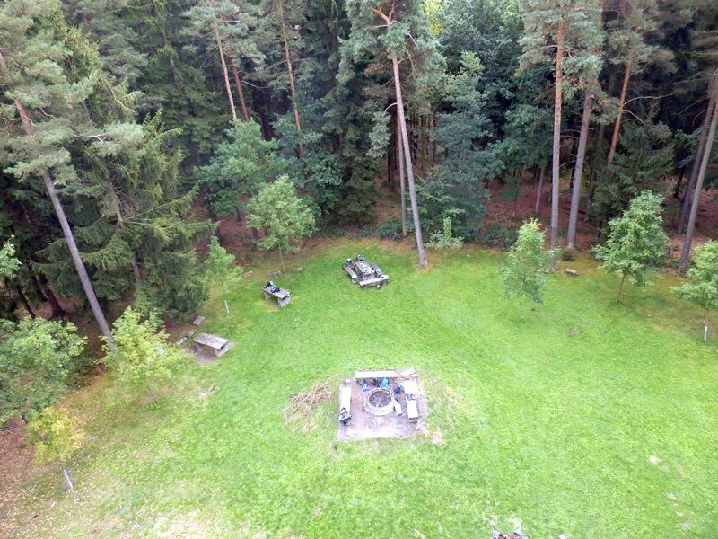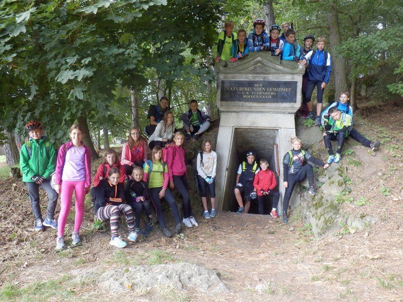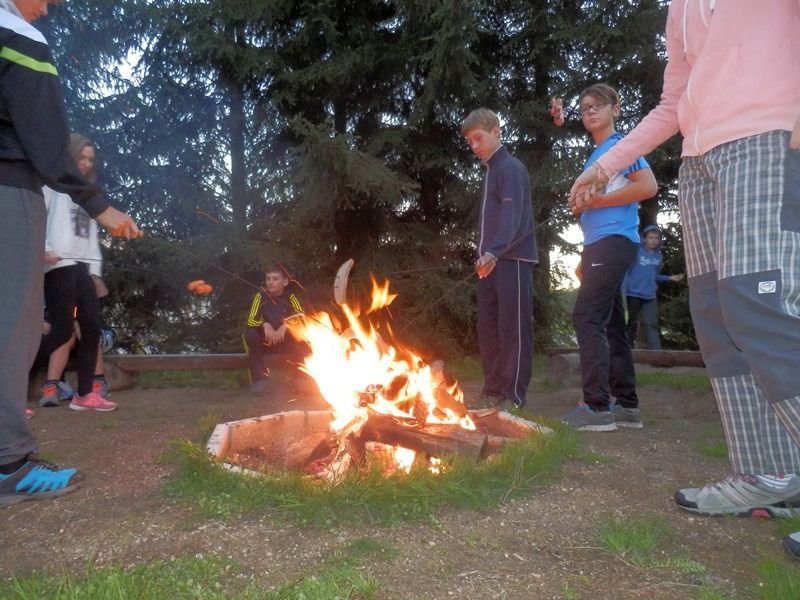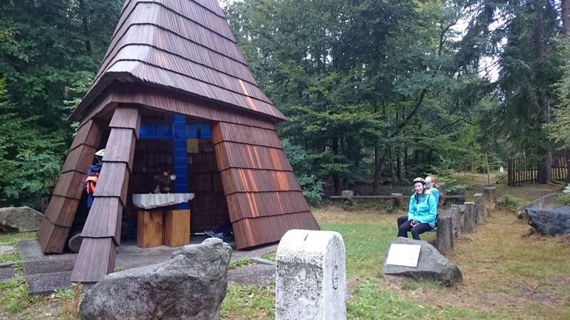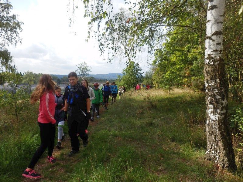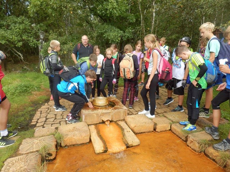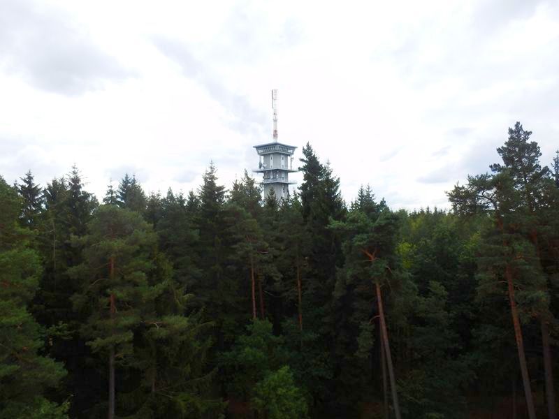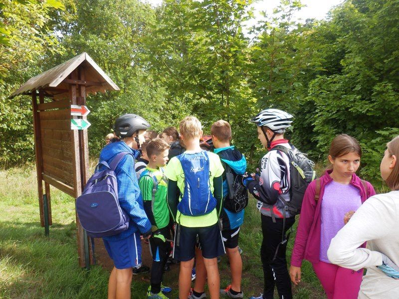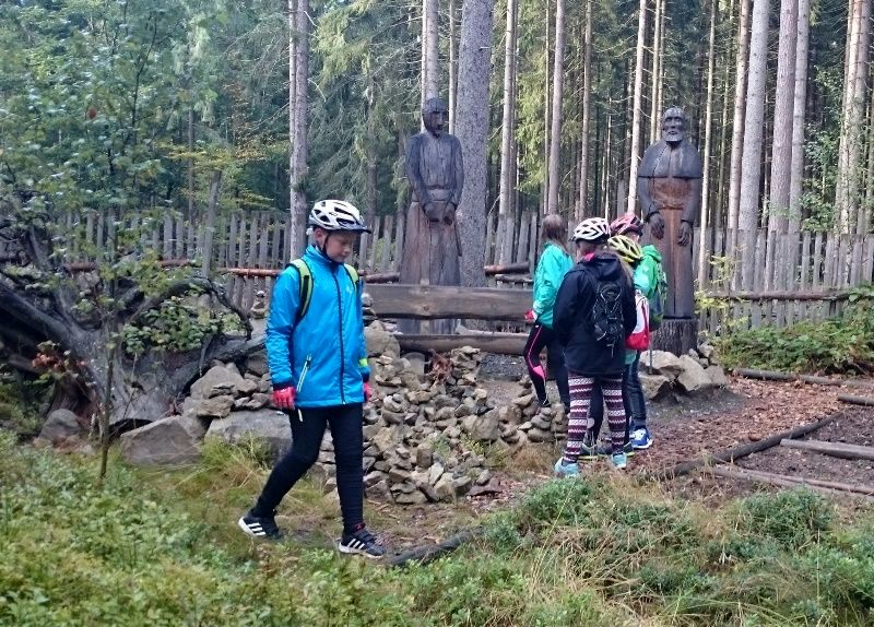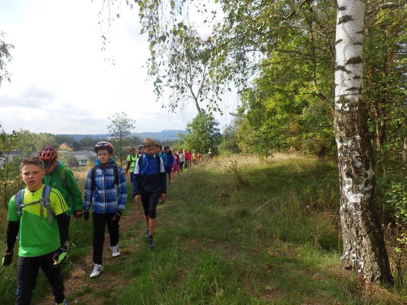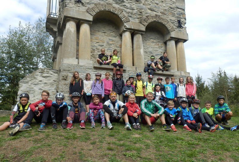 Rozhledna je to solidní, kamenná, postavena na začátku minulého století turistickým spolkem z Chebu. Až k výhledu je to 70 schodů tvrdí Petra, paní učitelka se dostala k číslu 72. Nevím komu mám věřit, vyberete si. Je krásný pohled na okolní krajinu - Cheb, Smrčina i Český les jako na dlani. Po prohlídce, část svěřenců hledá kešku, část běhá po lese s kouzelnými hůlkami, někteří rozumně relaxují. Pokud nevíte co je to kouzelná hůlka, pokusím se to vysvětlit. Hoši ze 7.ročníku, ti co se jim nedaří uklízet, mají údajně ve skříni trpaslíka. Nevím kde se tam vzal, ale kouzelná hůlka pomáhá v potírání jeho schopností. Inu nebudu jim brát iluze, ale nerozumím tomu, proč teď běhají po lese a řvou. Pár skalních houbařů, už zase čenichá houby, tentokrát naštěstí nesbírají, ale jenom hlásí nalezené kusy. V očích mají smutek, že jsou o tuto kratochvíli násilím připraveni.