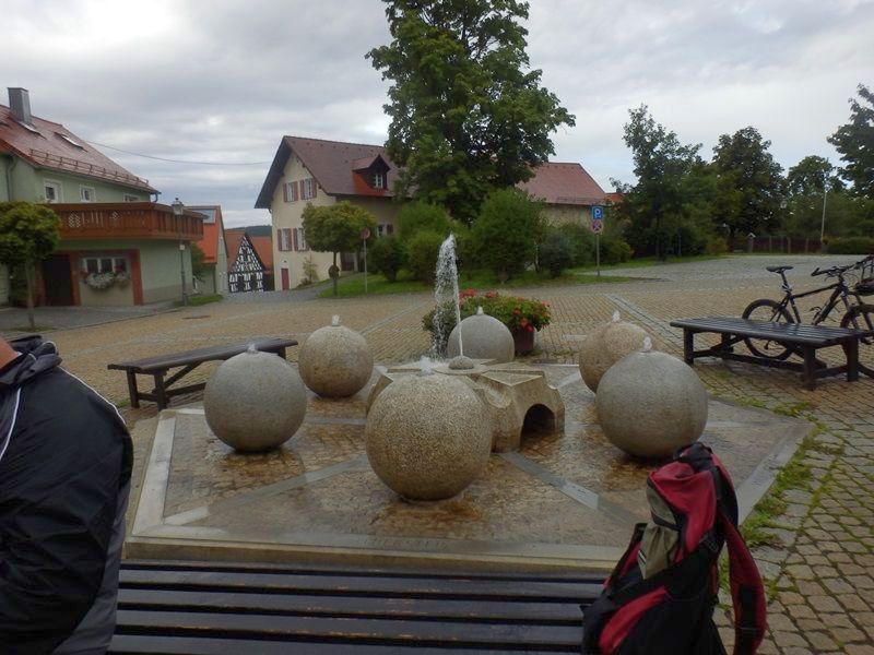Polední klid do 14:30 prodlužujeme o půl hodiny, venku opravdu intezivně prší. Ale 15. hodina to rozhodla, sice ještě mží, ale vypadá to nadějně. Vyndaváme kola z garáže a další závada, poloprázdná pneumatika u kola jedné z dívek. Po trochu větší námaze Ondra nahustí. Problém byl, že ventilek byl zaražený až do ráfku. Podařilo se a vyjíždíme směr Hohenberg. Vysvětluji Ondrovi cestu, má to být po cyklostezce, ale ouha, asi po kilometru zatáčí Ondra prudce vpravo, jedeme po louce. Pohoda vzápětí končí, protože před námi je strž a cesta zpevněná dřevěnými schody. Sklon asi 45%, délka 80 - 90 metrů. Sesedáme, kola vláčíme vedle sebe, ti fyzicky zdatnější je nesou, Anežce je musím nést já, protože to v žádném případě nemůže zvládnout. Dolů se naštěstí dostáváme bez úhony. Trochu mi to připomíná památné překonávání Nežárky. I komentáře jsem se skoro zdržel. Další cesta k hradu je v pohodě, jenom musíme od Egru (Ohře) vystoupat asi 200 výškových metrů po krásné silnici se serpentinami. Jak říkají skalní cyklisté: "Kopce jsou kořením cyklistiky." U hradu se fotíme u krásné fontánky s vodotrysky, prohlížíme nádvoří hradu, který nyní slouží jako školicí středisko.