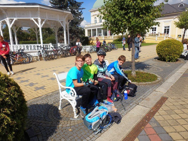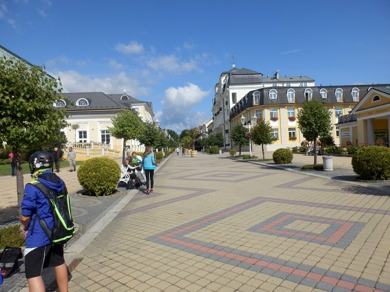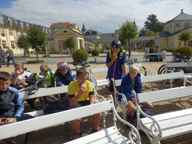 Nejprve fotografování u Františka. Snad jeho pomoc nebudou v budoucnu naše děvčata potřebovat. Hledáme kam umístit kola. V lázních zřejmě nejsou cyklisté vítáni, protože v centru není jediný stojan na kola. Asi místní politika, hosté ano, cyklisté ne. Nakonec kola opíráme o lázeňské lavičky. Připadám si trochu jako barbar, ale jinak to nejde. Musíme vyzkoušet místní léčivý pramen, naši svěřenci se po většinou netváří nějak nadšeně, nechutná jim. Potom rozchod – nákupy, oplatky, zmrzlina, lízátka, pohledy a vše co ospalá kolonáda a okolí nabízí. S paní učitelkou si dáváme v Cukrárně u Františka kávu a dort, z mraků konečně vylezlo sluníčko. Na pár dnů si dovedu představit, že bych se věnoval lázeňskému životu.