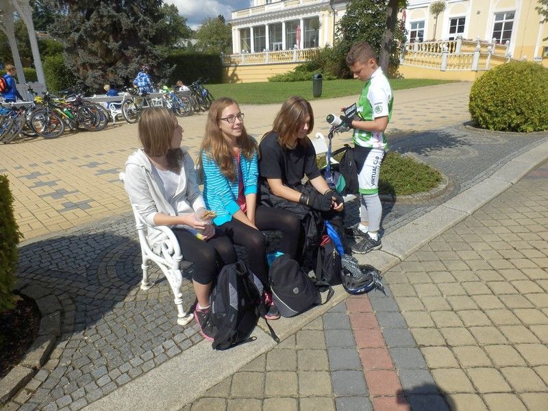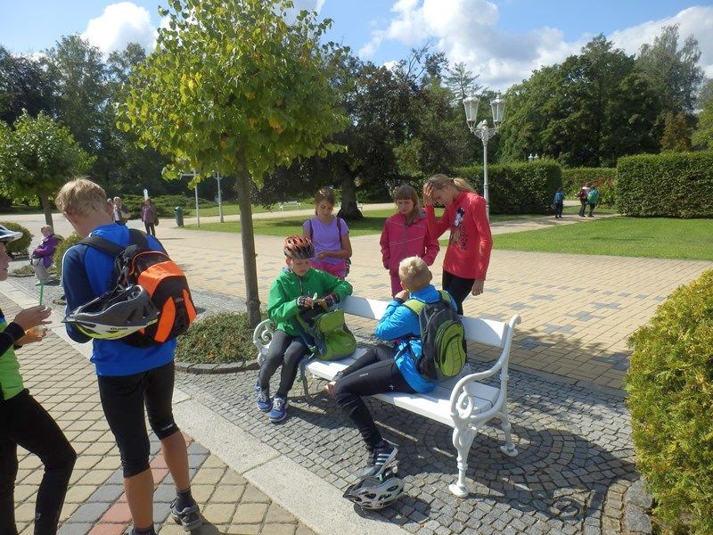 Důkladná porada o další trase. Směr a postupné cíle jsou jasně stanoveny. Projíždíme Františkovými Lázněmi jako nůž máslem. Na několika křižovatkách zastavujeme provoz a budíme všeobecný zájem, Jeden z místních se ptá jestli to je ten peleton Tour de France, asi ještě tolik cyklistů neviděl pohromadě. Uháníme svižným tempem a zákonitě se po pár kilometrech roztrháme na menší skupinky. My na chvostu, co musíme opravovat spadlé řetězy a od šmíru už jsme i na nose v jedné chvíli ztrácíme přehled. Měli jsme jet po modré, ale to čelo skupiny ignoruje. Míří kamsi ne severozápad, přitom potřebujeme jet na jih. Na telefonické výzvy hoši nereagují . Rozmýšlíme se co dál. Naštěstí zvolená cesta se ukázala jako slepá a čelo skupiny se vrací. Přebírám vedení, protože dále nehodlám riskovat chyby v kurzu. Sluníčko zalezlo a začíná být zima, navíc jak už to u nás bývá, když jedete na kole, fouká proti. Kolem páté hodiny přistáváme v Libé u konzumu, všichni zvládli jak závěrečné stoupání tak nebezpečné klesání kolem zámku bez úhony. Drobné nákupy a hurá domů. Při příjezdu vydán pokyn k odpočinku. Za pár minut si hoši přijdou pro míč, aby si mohli zakopat, další skupina běhá kolem stolu a hraje pinkponk. Ujetých 44 km je nechává zcela lhostejnými. Naštěstí alespoň několik holčiček je unavených a odpočívají.