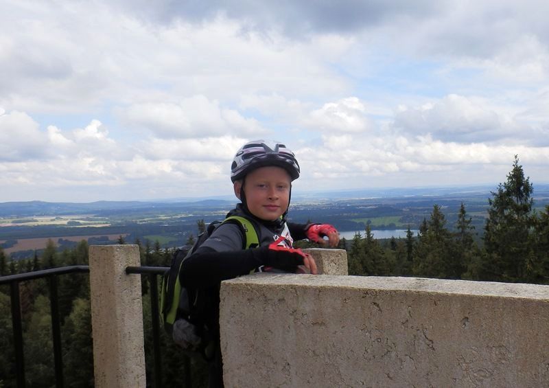 V půl desáté jsme všichni, včetně marodů, připraveni k odjezdu. Opět závady, Štěpánce dofouknout kolo, Michalovi vyměnit duši. Naštěstí má náhradní, takže je to na to tata. Večer vadnou zalepíme, snad nebudou další defekty. Prvním postupným cílem je Zelená hora s Bismarckovou rozhlednou. První část cesty, po známé signálce cyklistické trasy 2063 a 2243, je v pohodě. Devadesát procent trasy je z kopce a mužstvo šlape jedna báseň. V obci Pomezí jsme za cca 20 minut. Pak, ale přichází zrada, stoupání přes Dolní a Horní Hraničnou. Rozhledna je takřka na dohled, ale cesta se podivně kroutí a hlavně její kvalita je zoufalá. Zase se jedná o cestu vytvořenou asi pro pohraniční stráž, kterou od revoluce nikdo neudržoval, z ojedinělého asfaltu trčí špičaté kameny. Kupodivu nikdo nepíchl. Což uprchlíkům vepředu to nevadí, ti pádí jako pštrosi, které vidíme na jedné ze zahrad. Ale my v grupetu trpíme. Převážně po svých tlačíme kolo do kopce. Těch pár rovinek nestojí ani za řeč. Nikdo nereptá, u některých je vidět, že mé nadšení z cyklistiky právě nesdílí. Přiznám se, i já na malou chvilku podléhám drobné depresi. Každý kopec jednou končí. U psího útulku v Horní Hraničné se po zhruba 7 km stoupání scházíme všichni. Porada o dalším postupu, po turistické zelené lesem cca 1,5 km nebo po cestě snad po vrstevnici asi další 3 km. Většina volí zelenou. Asi volili dobře. Mohu-li doporučit vždycky volte zelenou, vyplatí se to. Pár odvážlivců a já pokračuje po cestě. Na prvních 50 m to vypadá, že půjde o solidní asfaltku, ale po této vzdálenosti se opět mění na tankodrom. Protože rozhledna je coby kamenem dohodil, vstupujeme opět na pastviny a hlava nehlava jedeme nejktratší cestou po poli. Když se k rozhledně dostaneme, naši kolegové už v klidu svačí. Tentokrát se sázka na jistotu nevyplatila.