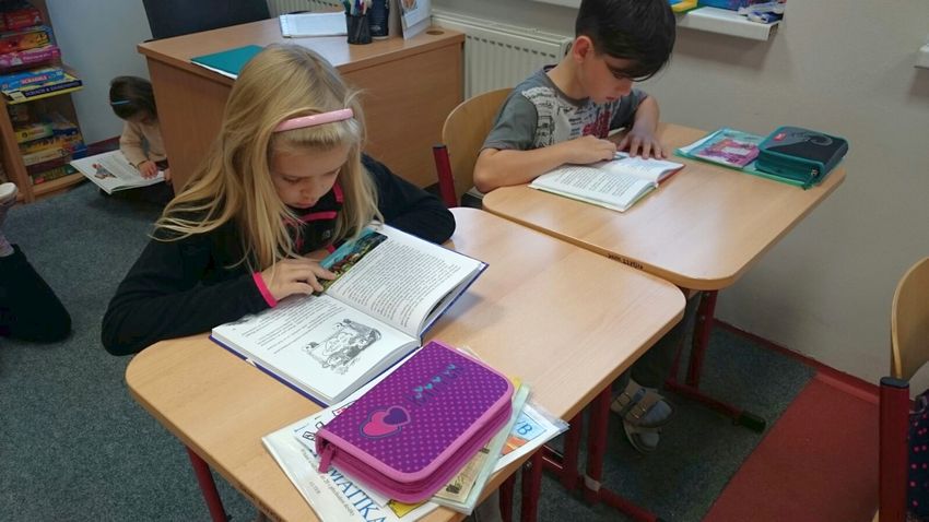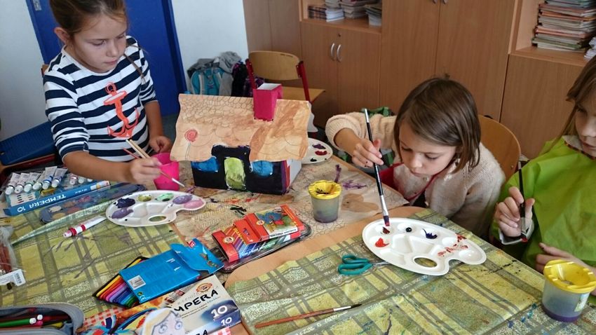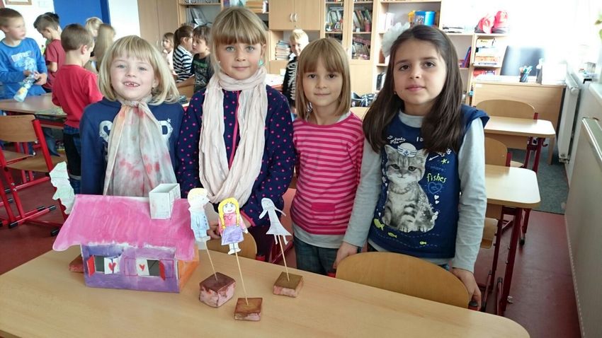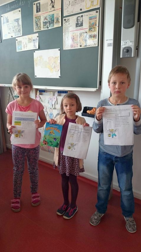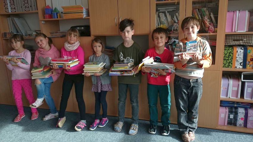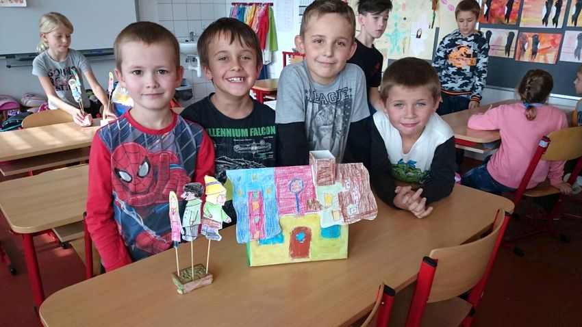 V pondělí se potom přidala práce s pracovními listy, kde žáci podle přečteného úryvku hledali spisovatele, ilustrátora a obrázek hlavních pohádkových postaviček, který si za odměnu vybarvili. V matematice nesměly chybět slovní úlohy o ničem jiném než o knihách. V úterý jsme připravovali na prodej knihy, které děti nosily z domova na školní sekáč. Ve středu vypukla nákupní horečka knih ve školní jídelně. Někteří si nakoupili tolik literatury, že ji ani nepobrali (jak ukazují fotografie). Jiní se zase poprvé seznámili s profesí prodavače knih, kdy za vydatné pomoci kamarádů ze 4. A prodávali u našeho třídního stolečku knihy. Už se těšíme na výdělek – v létě půjdeme do cukrárny! Čtvrtek byl celý pohádkový – projektový den – Perníková chaloupka. Z papírové chaloupky děti ve skupinkách tvořily perníkovou chaloupku, vystřihovaly a lepily Jeníčka a Mařenku. Seznámily se s touto pohádkou od různých autorů – poslech, četba i opis.