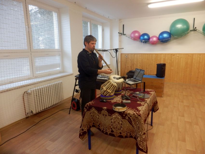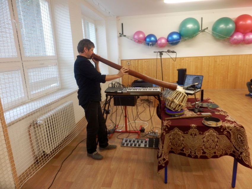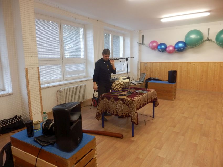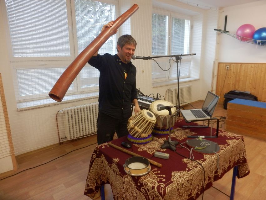 V úvodu zběžně představil svůj projekt s názvem Omnion - jeden člověk/hodně nástrojů, poté ukázal co je looping i živé smyčkování. Pak už došlo na dlouho očekávanou praktiku beatbox, kterou si žáci mohli sami vyzkoušet.Naučili  se tradicni indickou rytmickou říkanku s tably a s didžeridu.Seznámili se i s pojmem „věčný dech“ a závěr koncertu patřil písni SVATÝ VÁCLAVE , která byla podložena HipHopovým rytmem.