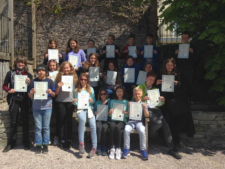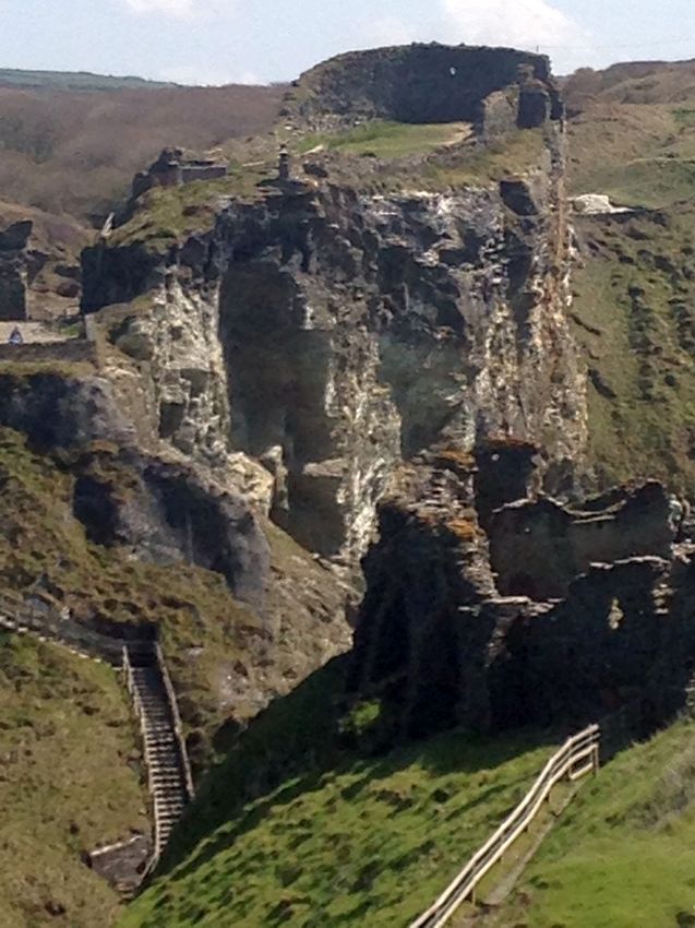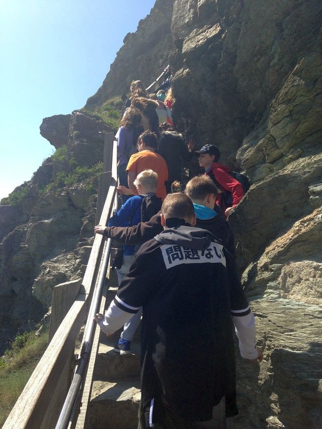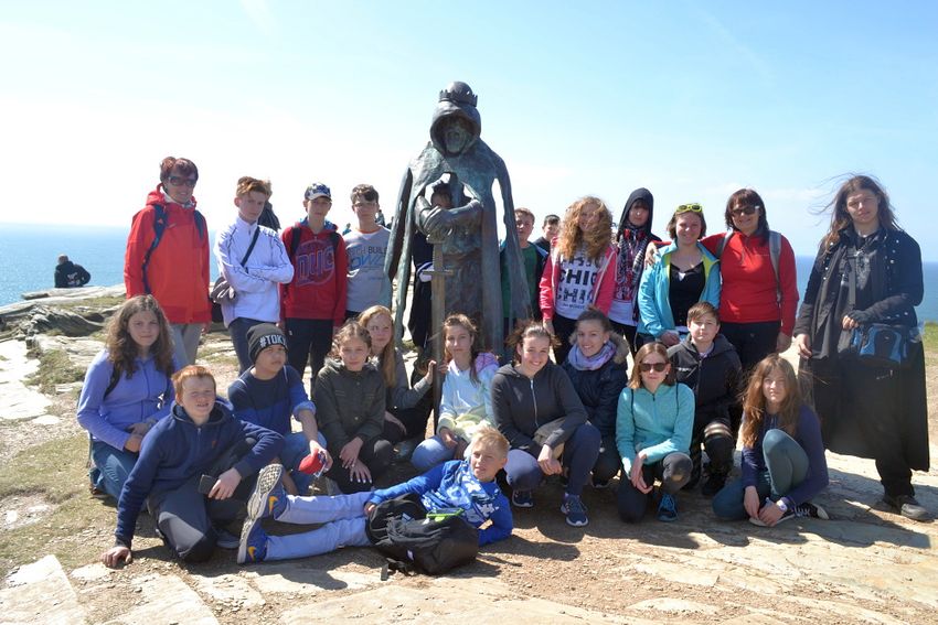 Poté co jsme sešli ↓, šplháme po úzké cestičce ↑. Náročný terén zdoláváme všichni bez problémů, odměna stojí za to – výhledy na zříceniny starého hradu, pobřeží. Potkáváme i samotného krále Artuše, neodmítáme nabízené společné foto. Pěkně tu fučí, máme pocit, že za chvíli vzlétneme, proto se raději vracíme ↓. Nicméně nás čeká cesta ↑. Nevracíme se stejnou, ale stoupáme do protějšího kopce, kvetou zde jarní rostliny – prvosenky, orseje, blue bells… nad přehlídkou mechů, lišejníků a kapradin na místních kamenech, zídkách… srdce mladých přírodozpytců jásají. Nahoře na nás čeká autobus, nasedáme, máváme jeho veličenstvu Artušovi a rytířům kulatého stolu a míříme zpět do Torquay ke svým rodinám. Zítra nás kromě jiného čeká i velký shopping! Tak hurá do postýlek.