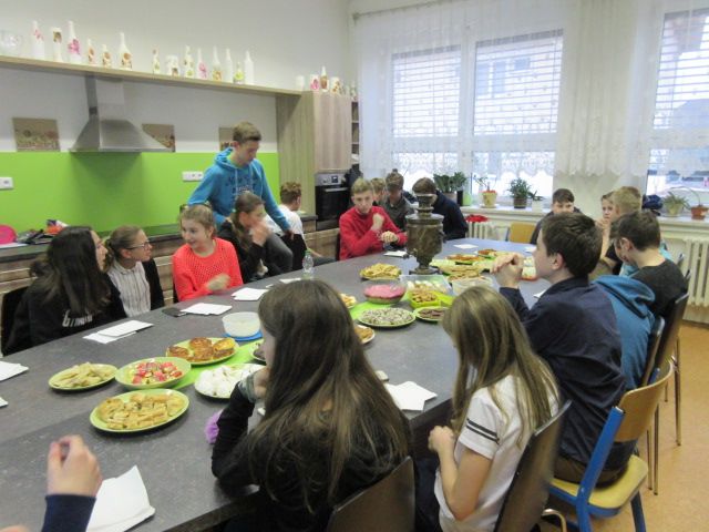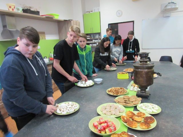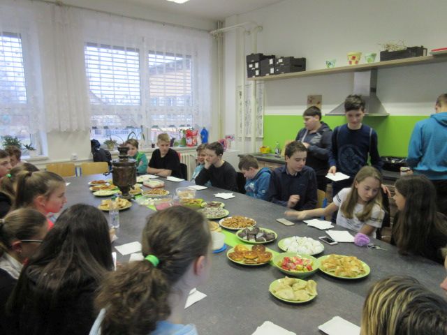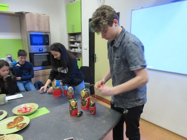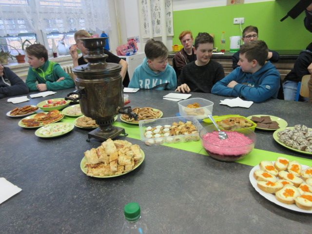 Nejdřív jsme recitovali a zpívali vše, co známe a umíme. Vyslechli jsme recitátory s básněmi A.S. Puškina, S. Maršaka, V. Vysockého a M. Cvětaěvé. Porotou byli sami žáci, a věřte, byli přísní. Po recitaci přišla, alespoň pro některé, asi příjemnější chvilka – ochutnávka ruských dobrůtek u opravdického samovaru a soutěž v rychlosti ve skládání "Matrjošky". Děkujeme dětem a zvlášť rodičům za pochopení, pomoc a podporu.